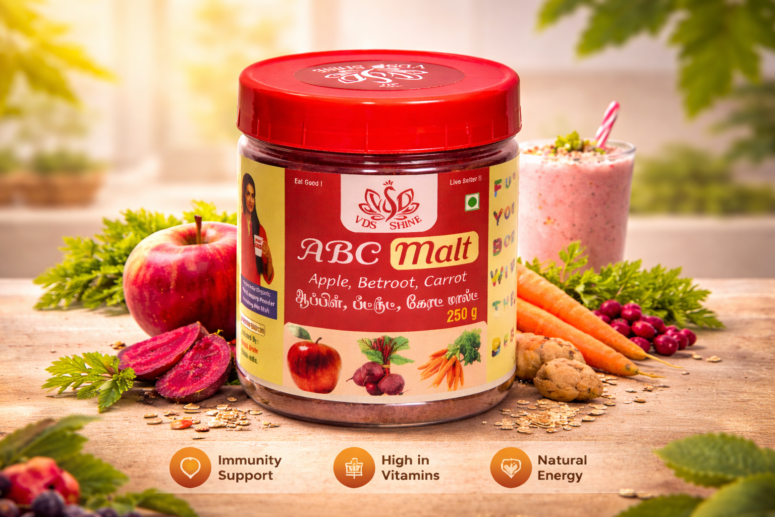 ABC Malt is a nutritious health mix made from the natural goodness of apple, beetroot, and carrot, offering a perfect blend of taste and wellness. Rich in vitamins, iron, and antioxidants, it helps boost immunity, improve blood health, and support overall growth and energy. The presence of beetroot aids in increasing hemoglobin levels, while carrot promotes better vision and glowing skin, and apple supports digestion and gut health. This wholesome drink is suitable for all age groups, providing natural energy without any harmful additives. Regular consumption of ABC Malt helps strengthen the body, enhance stamina, and maintain a healthy lifestyle.