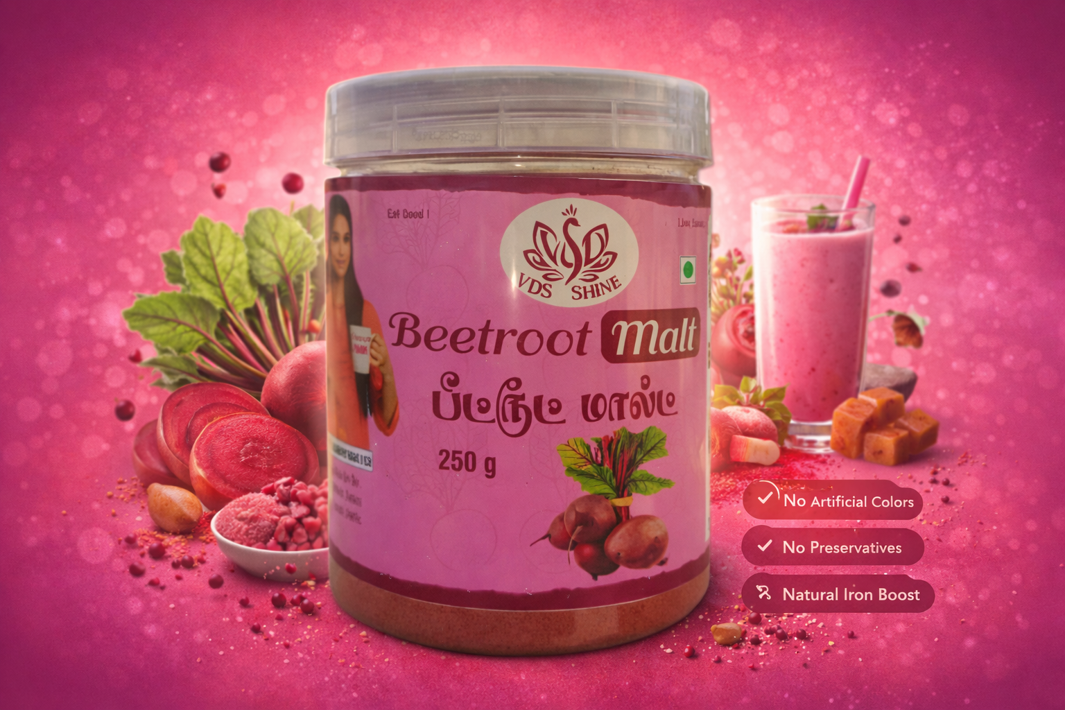 Beetroot Malt is a healthy and nutritious drink made from the natural goodness of beetroot, known for its rich iron and antioxidant content. It helps improve blood circulation, increase hemoglobin levels, and support overall energy and stamina. Regular consumption aids in boosting immunity, detoxifying the body, and promoting healthy skin. With its natural sweetness and easy digestibility, Beetroot Malt is suitable for all age groups, especially beneficial for those with low iron levels. It serves as a wholesome daily health drink that supports strength, vitality, and overall well-being.