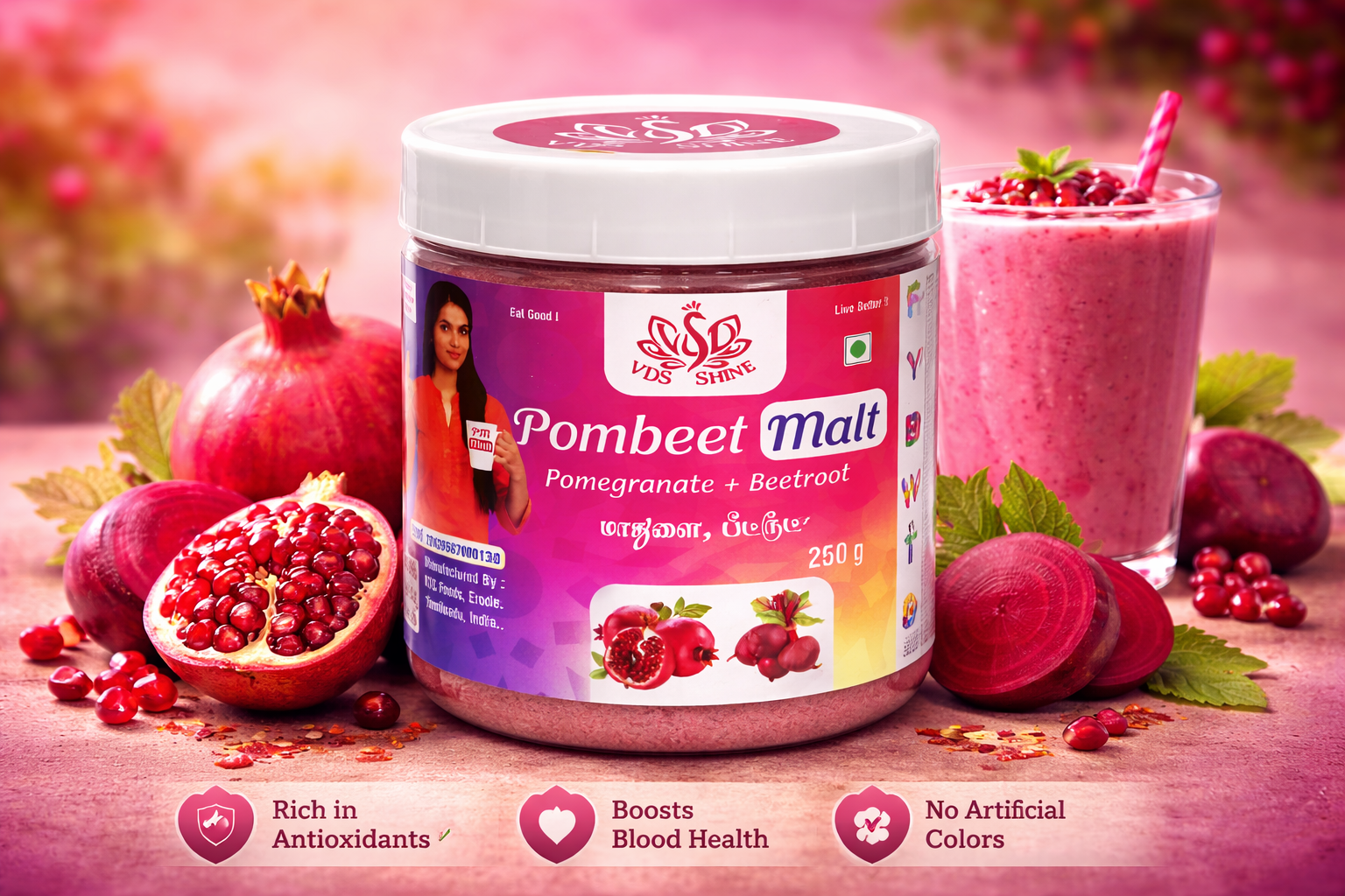 Pombeet Malt is a nutritious health drink made from the powerful combination of pomegranate and beetroot, both known for their rich iron and antioxidant properties. This blend helps improve blood health by increasing hemoglobin levels and enhancing circulation, making it especially beneficial for those with low iron. It also supports immunity, boosts energy levels, and aids in detoxifying the body. With its natural goodness, Pombeet Malt promotes healthy skin, improves stamina, and contributes to overall wellness. Suitable for all age groups, it is an excellent choice for a daily health drink that nourishes the body and keeps you active.